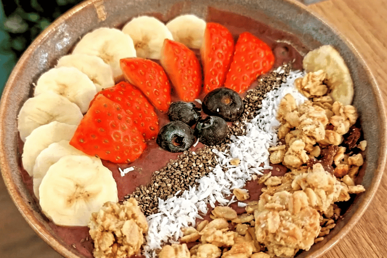 Pure açai base, banana, and oat milk. Topped with fresh fruit, chia, coconut, and granola.
