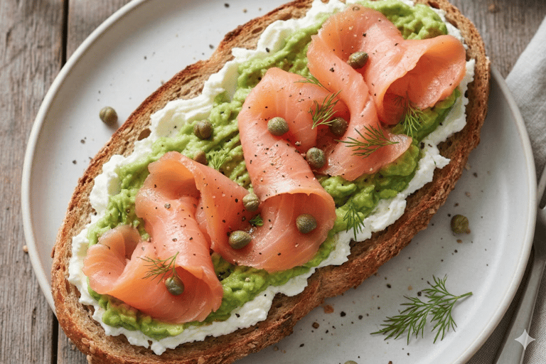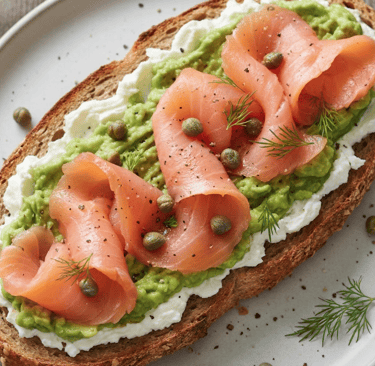 Salmón, aguacate, queso crema y alcaparras. Pruébala sobre bagel.
